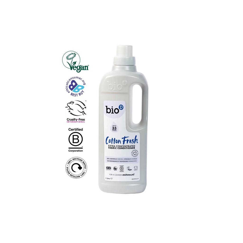 Packaged in a recyclable 1L bottle made from 100% post-consumer recycled plastic, Bio-D Cotton Fresh Fabric Conditioner is vegan, cruelty-free, and made in the UK — delivering softness and sustainability in one bottle.