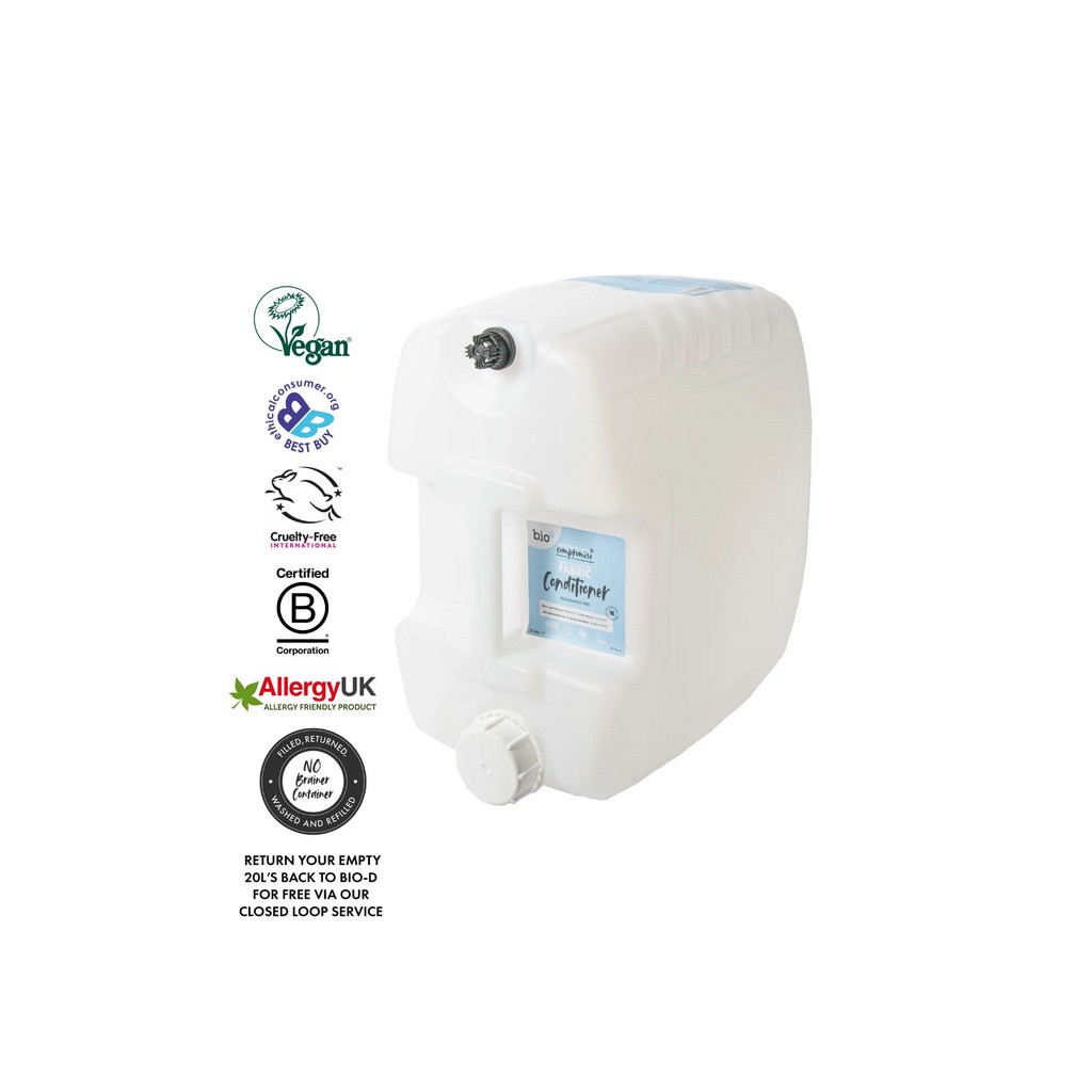 Bio-D Fragrance Free Fabric Conditioner 20 L offers natural softness without fragrance or harsh additives. Formulated with biodegradable, plant-derived ingredients, it reduces static and keeps fabrics comfortable and easy to iron. Perfect for allergy-prone and sensitive users, it’s dermatologically tested and free from synthetic dyes, perfumes, and preservatives. The 20 L bulk container supports refill systems and large-scale users, helping minimise plastic waste while delivering exceptional value. Safe for all fabrics and washing machine types, it’s vegan, cruelty-free, and produced in the UK under ethical and sustainable standards. By combining gentle care with responsible production, Bio-D ensures your laundry stays soft, fresh, and eco-friendly – wash after wash.