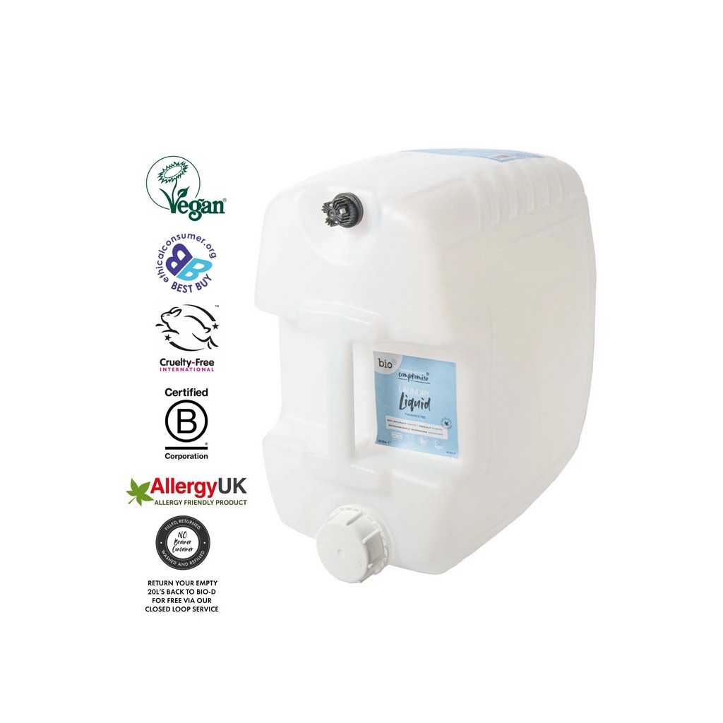 Packaged in 100% post-consumer recycled plastic, the 20 L container is ideal for refill stations or high-volume users looking to cut down on single-use plastics. Produced in the UK under vegan and cruelty-free standards, Bio-D Fragrance Free Laundry Liquid represents responsible cleaning you can trust.