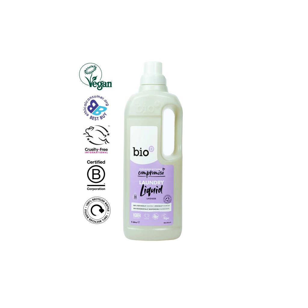 Bio-D Laundry Liquid Lavender 1 L delivers outstanding cleaning power with a soothing lavender scent. Made from renewable, biodegradable ingredients, it removes everyday dirt and stains while preserving fabric quality. Free from phosphates, optical brighteners, and chlorine, it’s suitable for sensitive skin and ideal for both machine and hand washing. Its concentrated formula provides great value while reducing environmental impact. Packaged in a recyclable 1 L bottle and manufactured in the UK under vegan and cruelty-free standards, this laundry liquid combines performance, purity, and peace of mind.