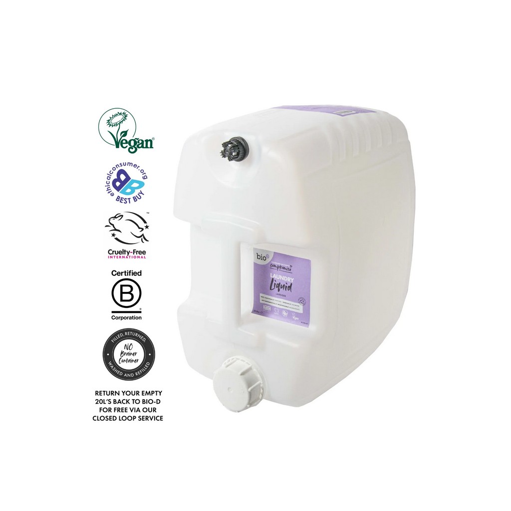 Bio-D Lavender Laundry Liquid 20L offers exceptional cleaning performance in an environmentally responsible formula. Made from renewable, plant-based ingredients, it removes everyday dirt and stains while leaving fabrics delicately scented with real lavender oil. The hypoallergenic, biodegradable formula is suitable for sensitive skin and effective even at 30°C, helping reduce energy use. Free from phosphates, enzymes, and optical brighteners, it keeps fabrics soft and colours bright without irritation. The 20L refill drum is ideal for bulk users or refill stations, cutting down single-use packaging while delivering excellent value. Produced in the UK under vegan and cruelty-free standards, this gentle detergent supports a cleaner, greener home.