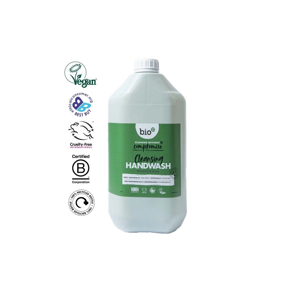 Bio-D Rosemary & Thyme Hand Wash 5L is a sustainable refill version of the popular botanical hand wash. Combining the natural freshness of rosemary and thyme essential oils, it effectively removes dirt while maintaining the skin’s softness and balance. Made with biodegradable, plant-derived ingredients, this hypoallergenic hand wash is suitable for sensitive skin and frequent use. The 5L container offers long-lasting value and supports refill systems, helping reduce plastic waste and carbon footprint. Produced in the UK to vegan and cruelty-free standards, it embodies Bio-D’s commitment to ethical and sustainable home care.